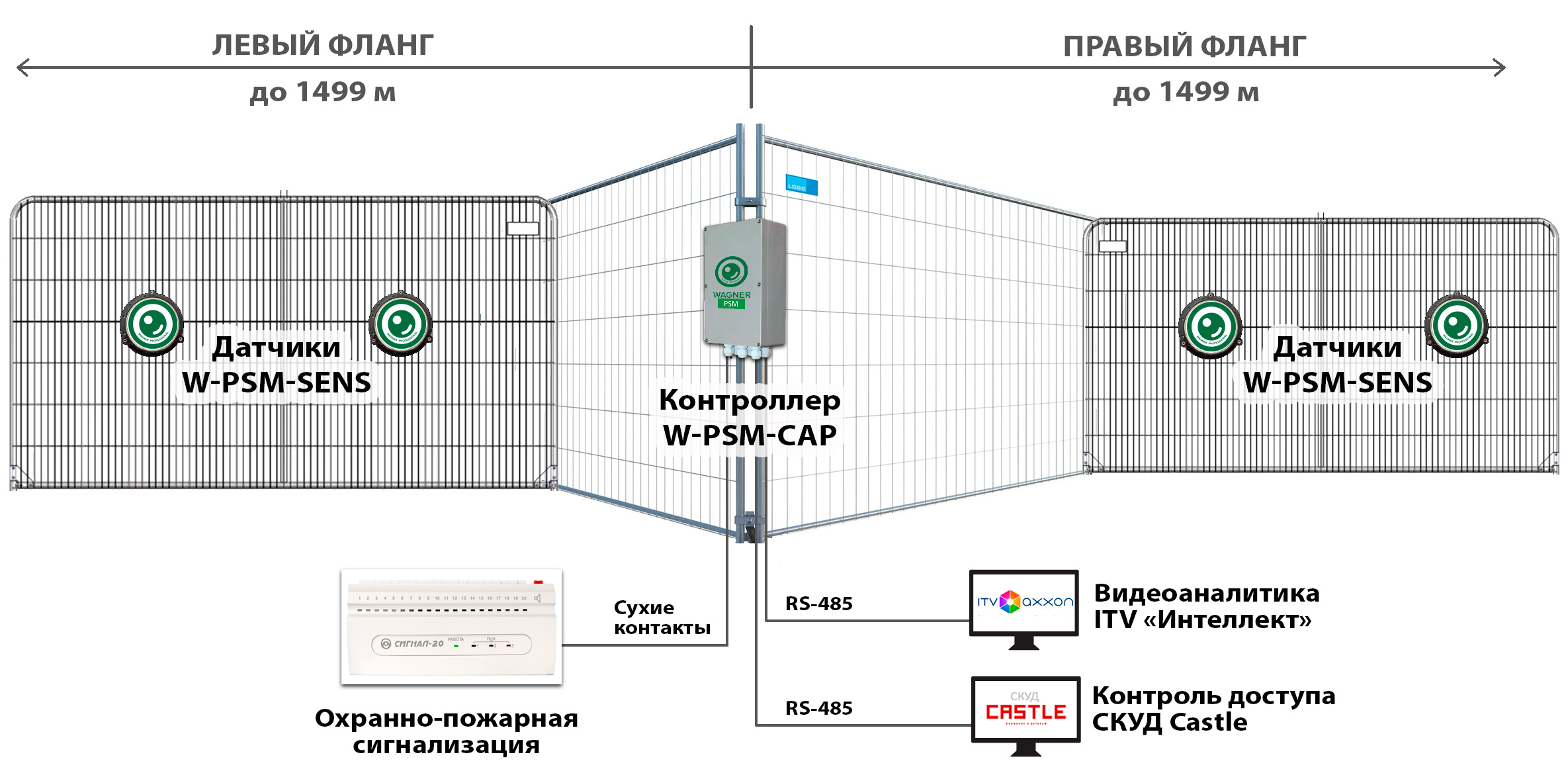 Модульность WAGNER PSM позволяет выстраивать дополнительный рубеж почти неограниченной длины. Кроме того, она легко интегрируется с внешними системами видеонаблюдения, СОТ, ОПС и СКУД. Все данные передаются с помощью цифрового протокола, а информация о состоянии датчиков поступает по интерфейсу RS-485.