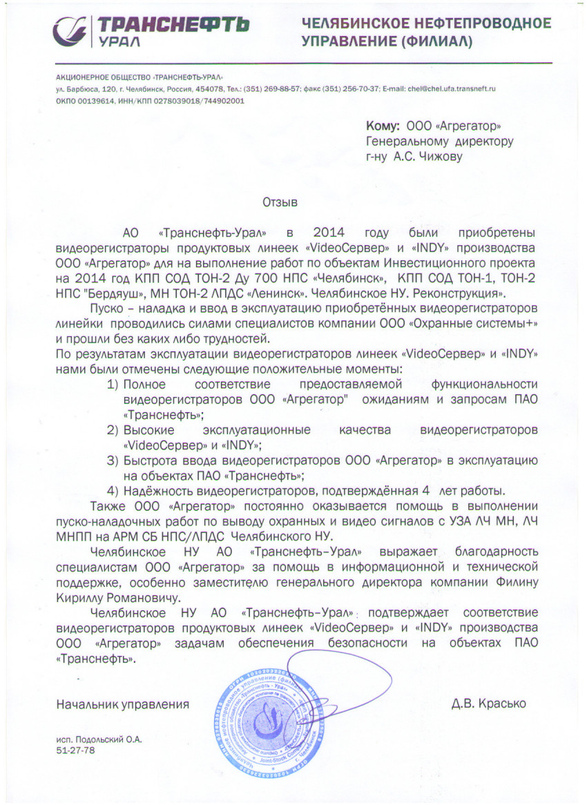Челябинское НУ АО «Транснефть-Урал»; подтверждает соответствие видеорегистраторов продуктовых линеек «VideoCepBep» и «INDY» производства ООО «Агрегатор» задачам обеспечения безопасности на объектах ПАО «Транснефть».